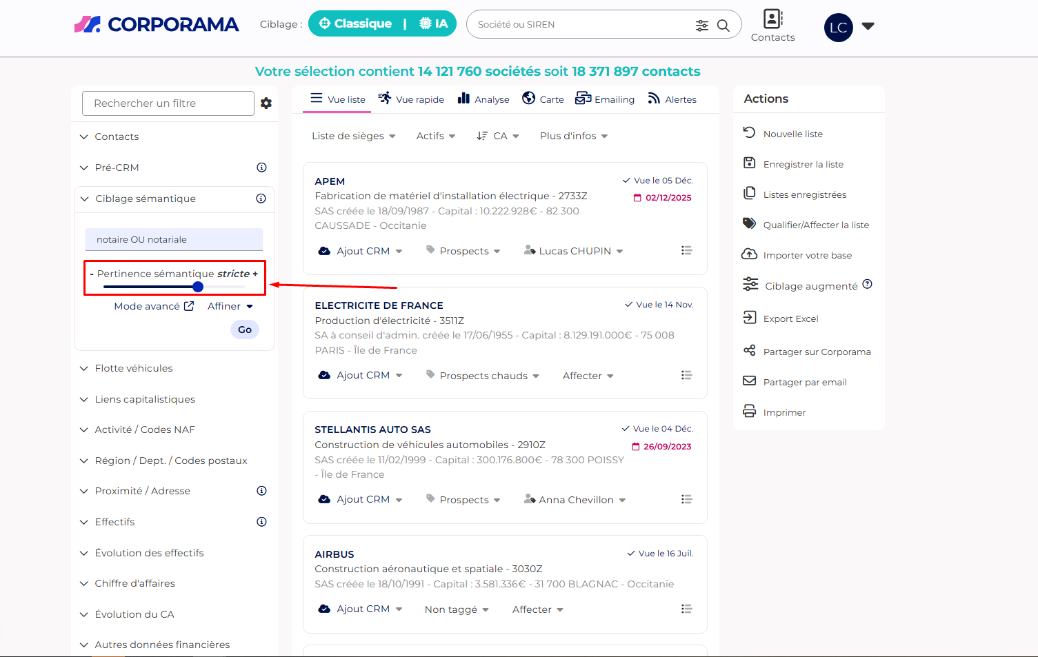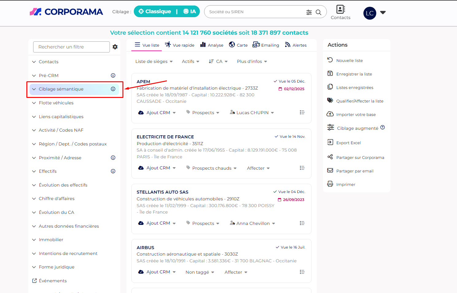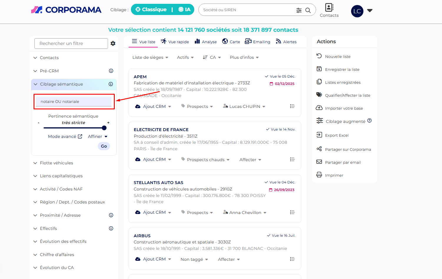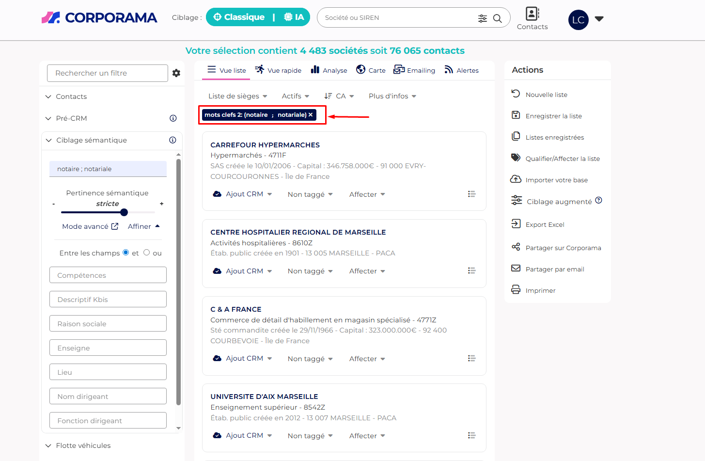 Le ciblage sémantique vous permet d’identifier des entreprises à partir de mots-clés métier, même lorsque le secteur ou le code NAF seul ne suffit pas.