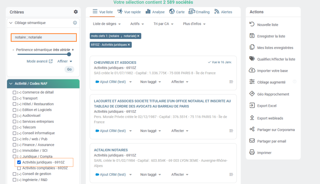 🔍 À titre d’exemple, nous souhaitons identifier toutes les entreprises exerçant une activité juridique (code Naf 6910Z) avec une spécificité notariale.
