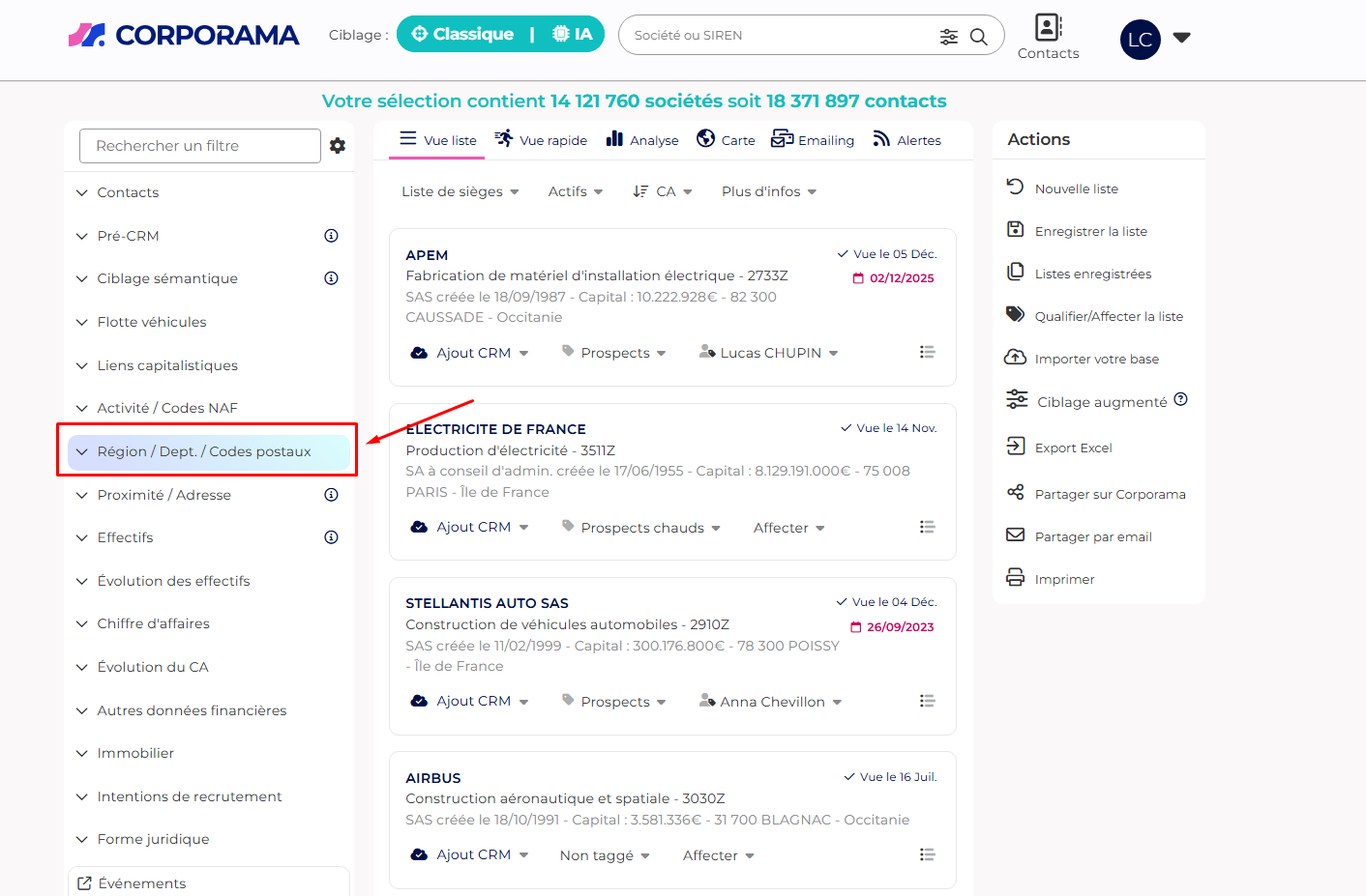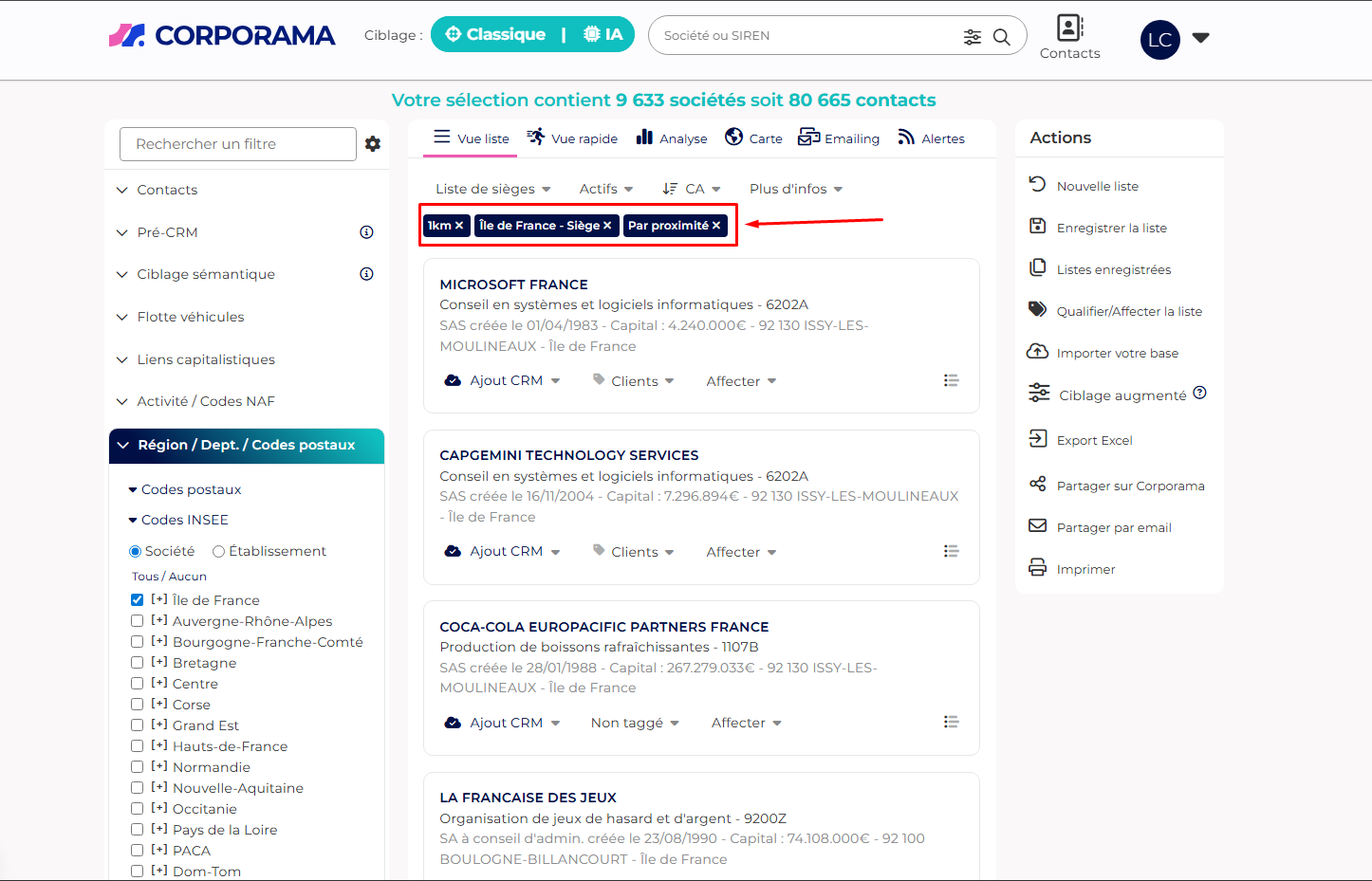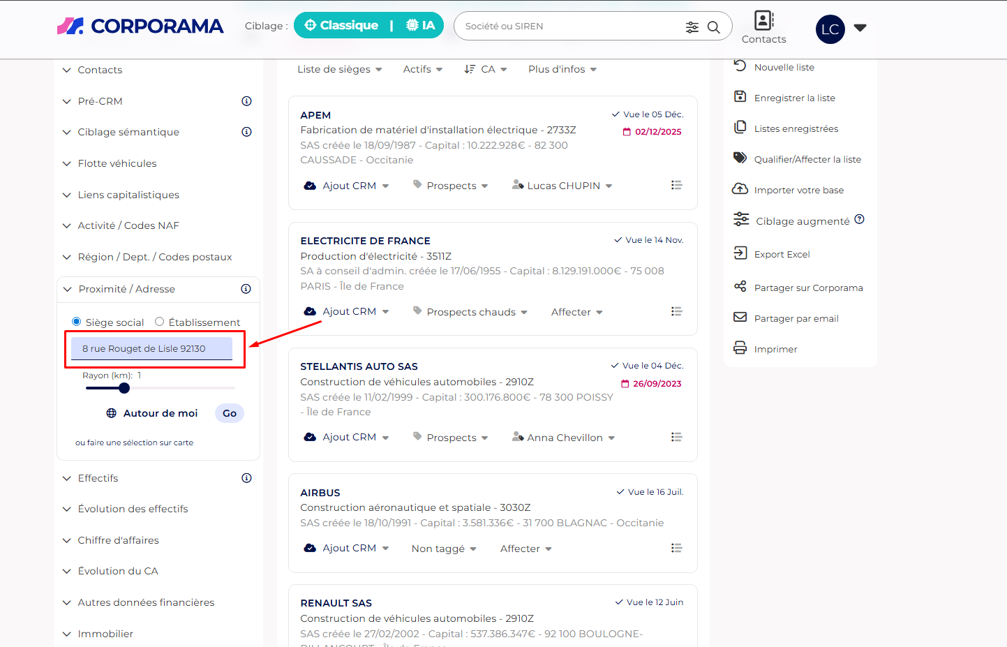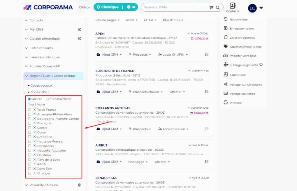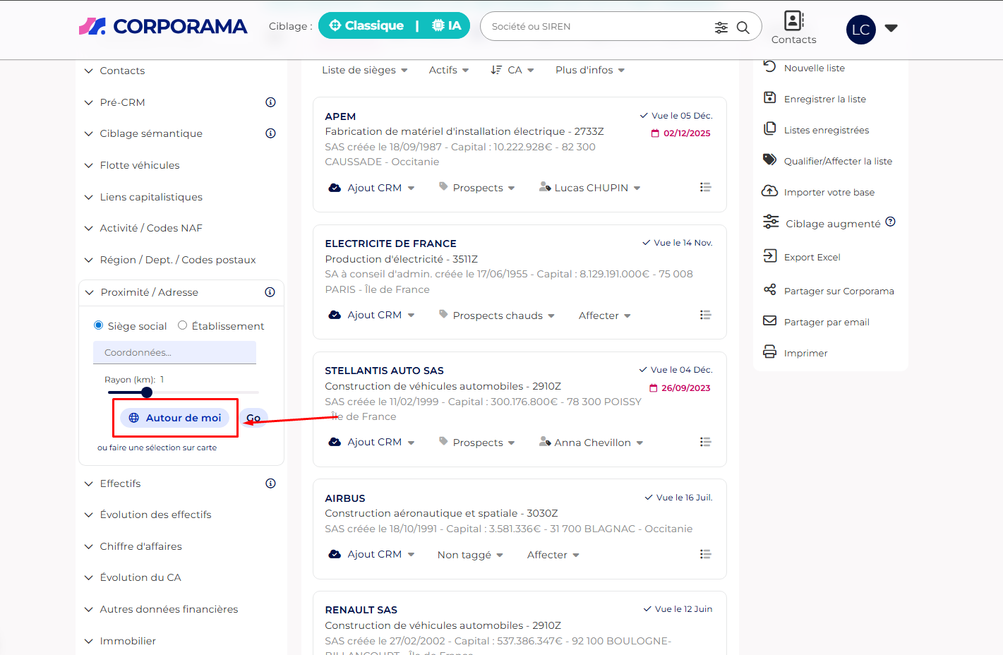 Corporama affiche une liste de sociétés situées dans la zone géographique définie.