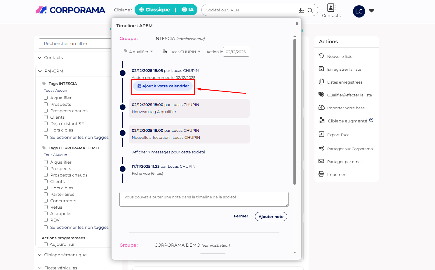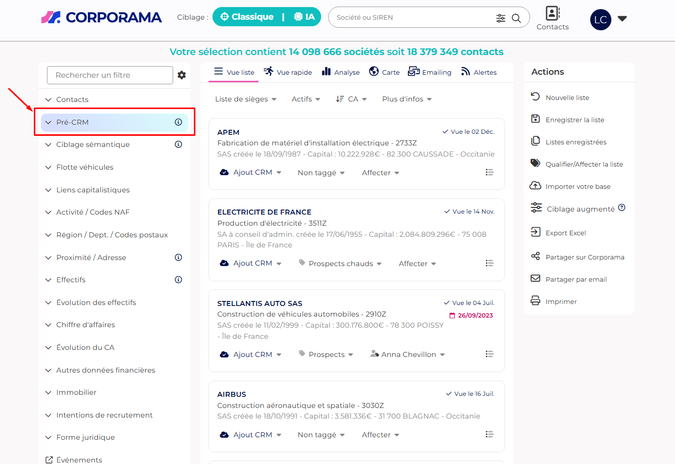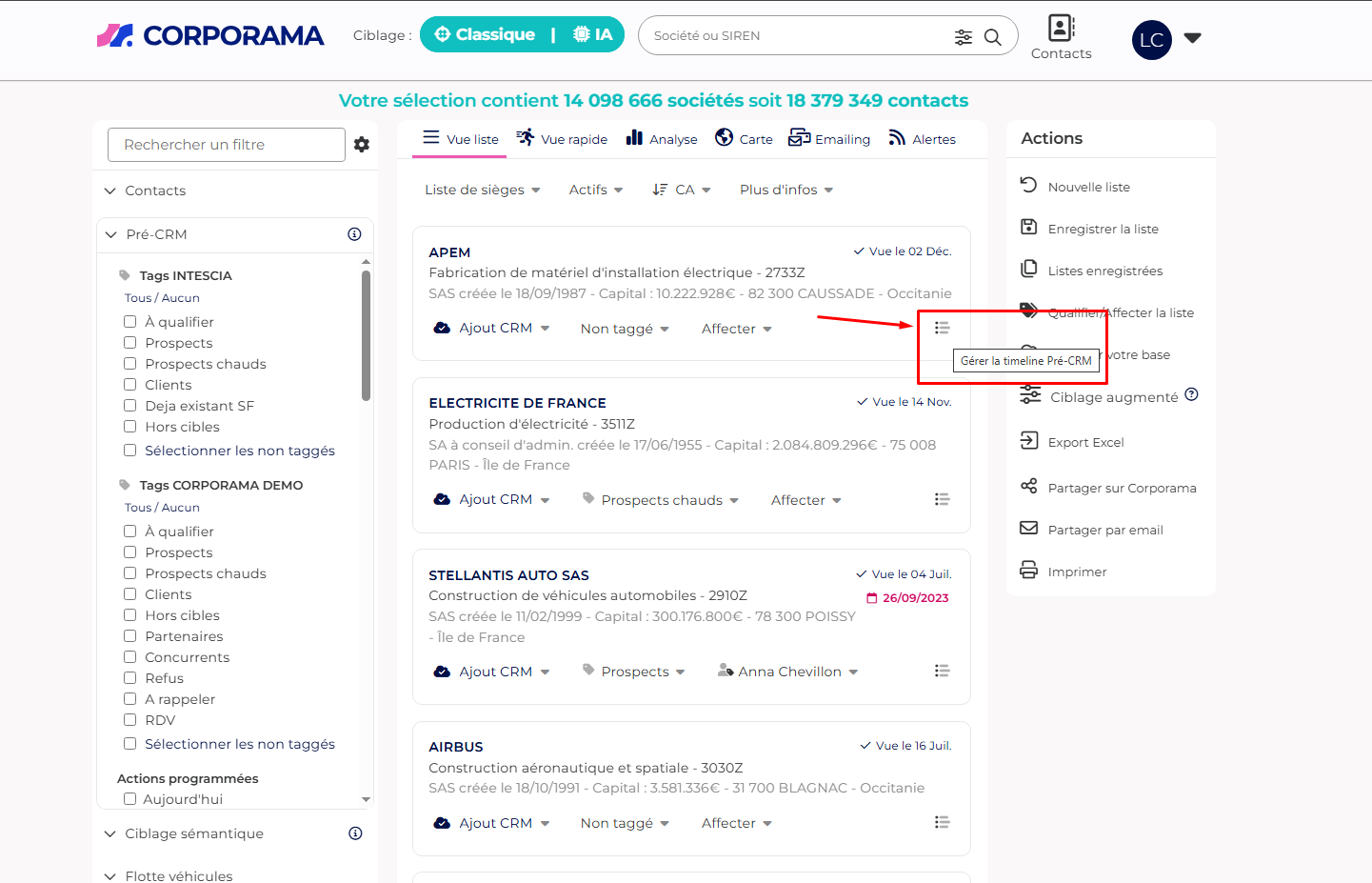 Le Pre-CRM est accessible depuis plusieurs endroits clés de Corporama :