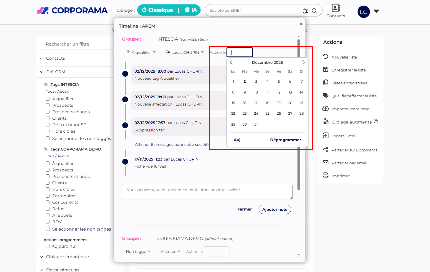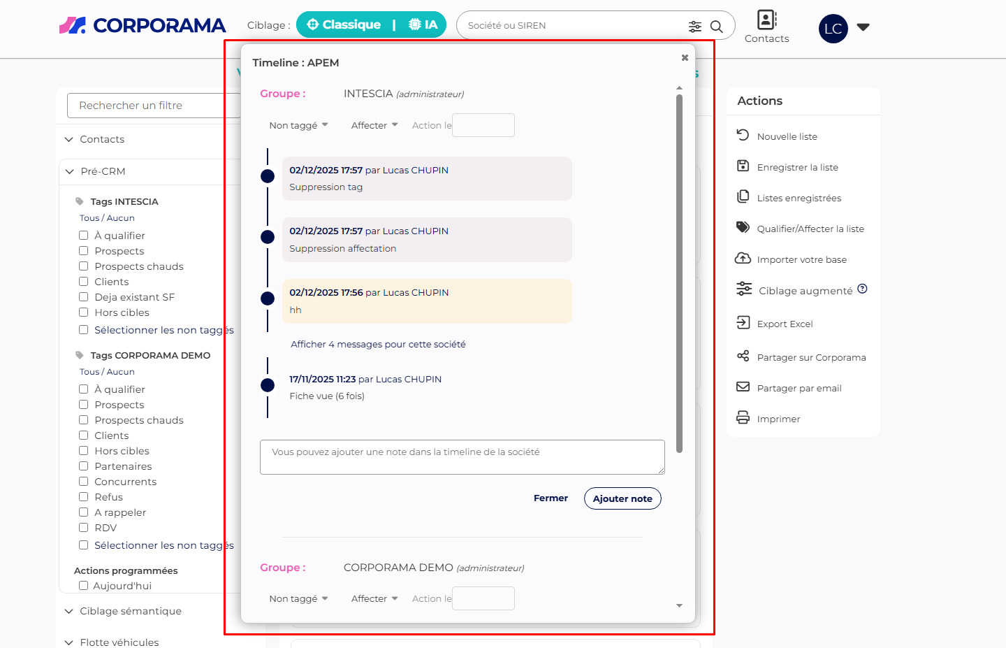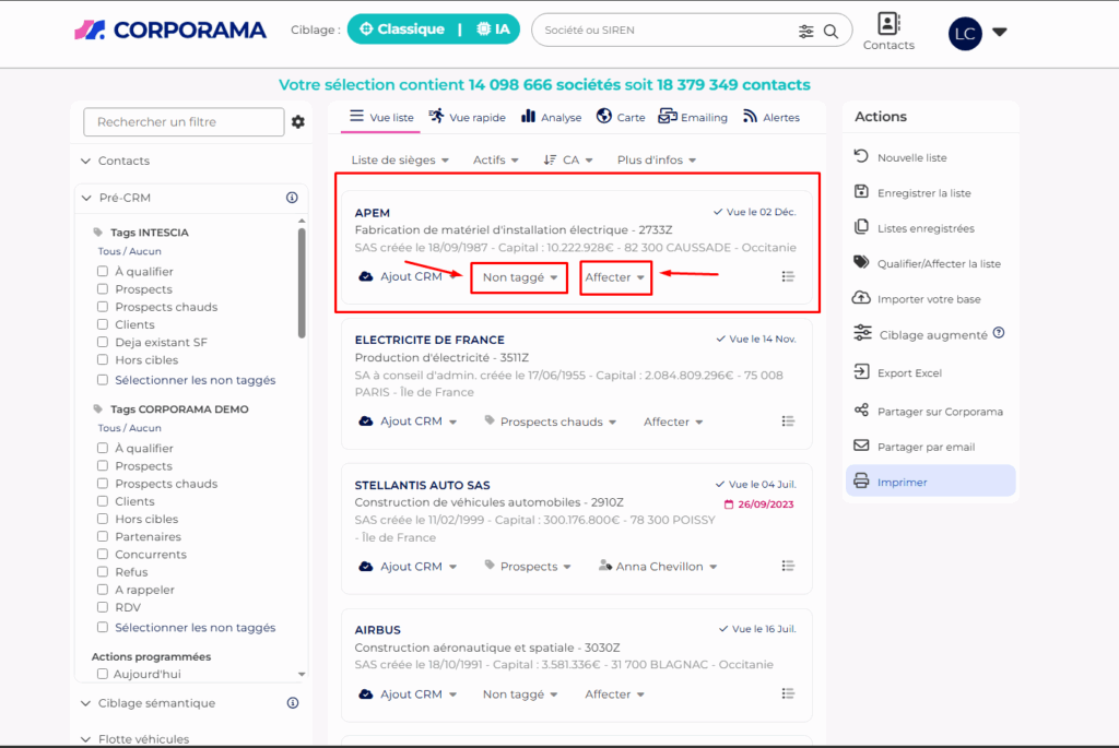 Vous pouvez combiner tags + affectations pour organiser votre prospection