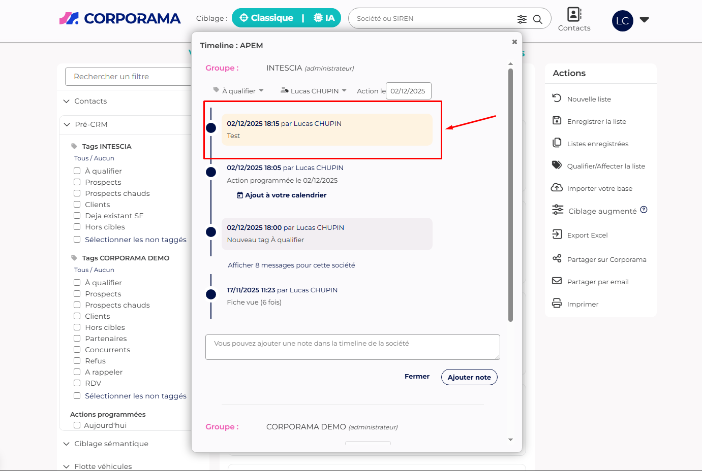 Une fois la note ajoutée, elle apparaît immédiatement dans la Timeline pour un suivi fluide.