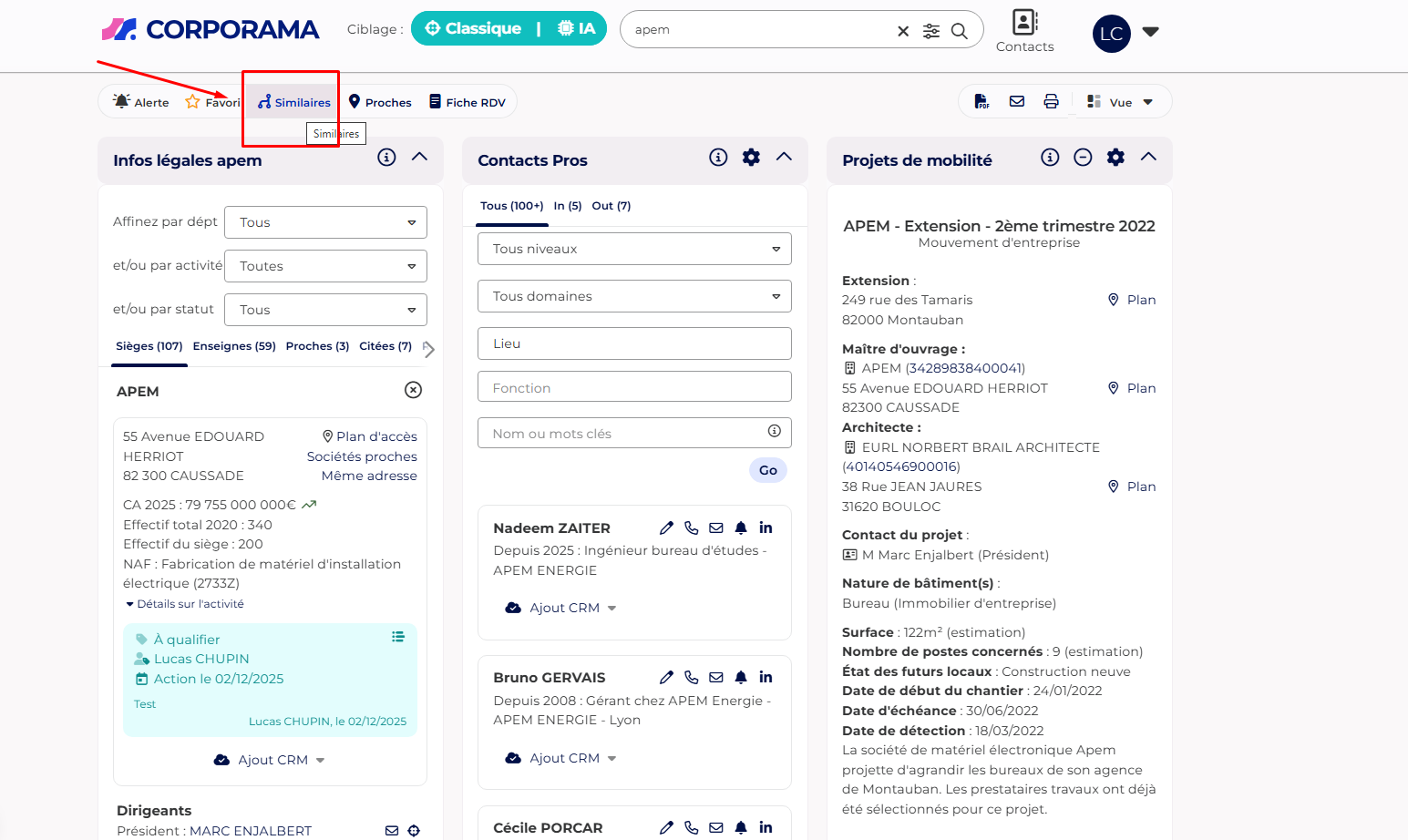 La fonctionnalité Sociétés similaires est disponible depuis une fiche société.