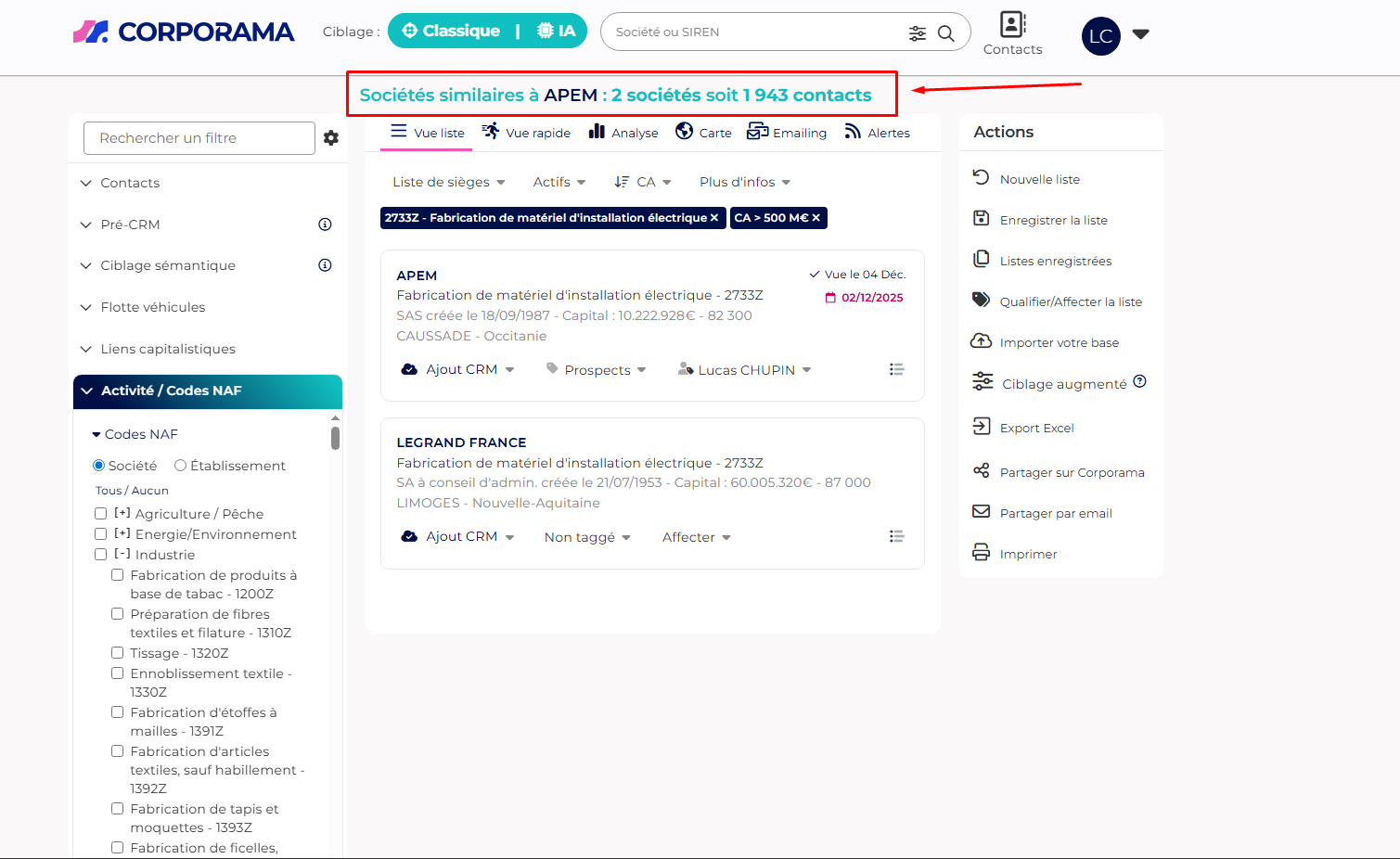 Une nouvelle liste s’ouvre automatiquement avec les sociétés similaires trouvées.