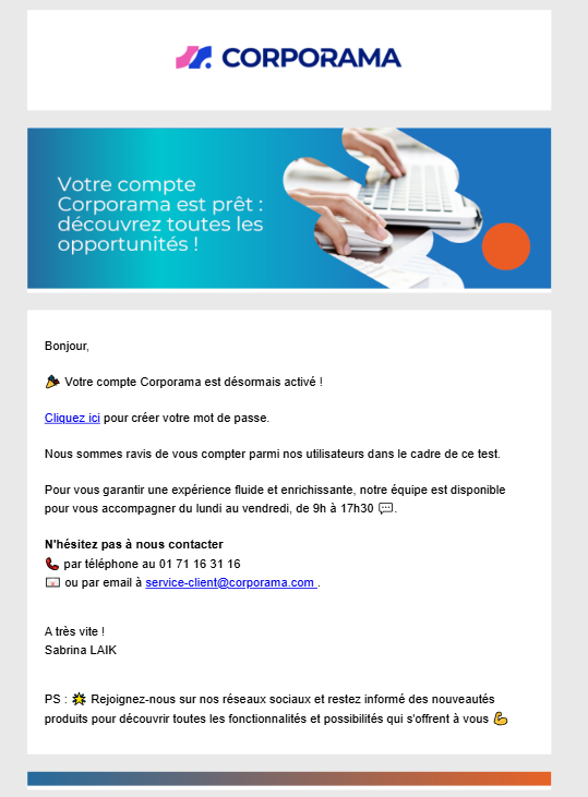 Lors de votre inscription à Corporama, un e-mail de bienvenue intitulé « Bienvenue sur Corporama » vous est envoyé.