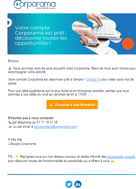 L’e-mail d’activation de compte ayant pour objet « Bienvenue sur Corporama » est envoyé à l’adresse e-mail utilisée lors de la configuration de votre compte. Ce message contient un lien d’activation unique qui doit être utilisé dans un délai de 48 heures à partir de la réception de l’e-mail.