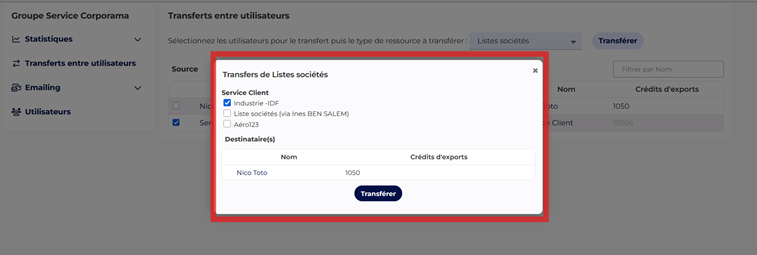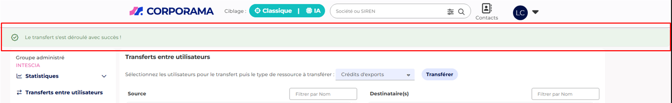 Une fois votre transfert validé (crédits, listes, fichiers ou paniers), Corporama vous affiche immédiatement un récapitulatif clair de l’opération effectuée. Cela vous permet de vérifier en un coup d’œil que l’action a bien été prise en compte et que les ressources ont été attribuées aux bons utilisateurs.