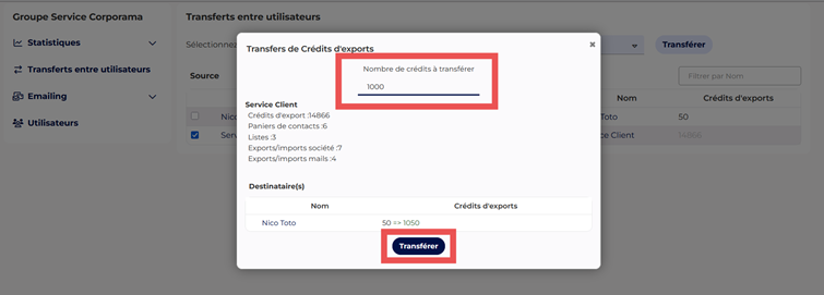 Dans le cas d’un transfert impliquant plusieurs destinataires (ex. crédits d’export), Corporama vous montre la répartition exacte appliquée entre chaque utilisateur sélectionné.
