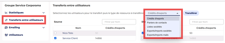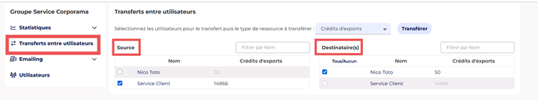 Transférer des ressources entre utilisateurs depuis la partie Administrateur